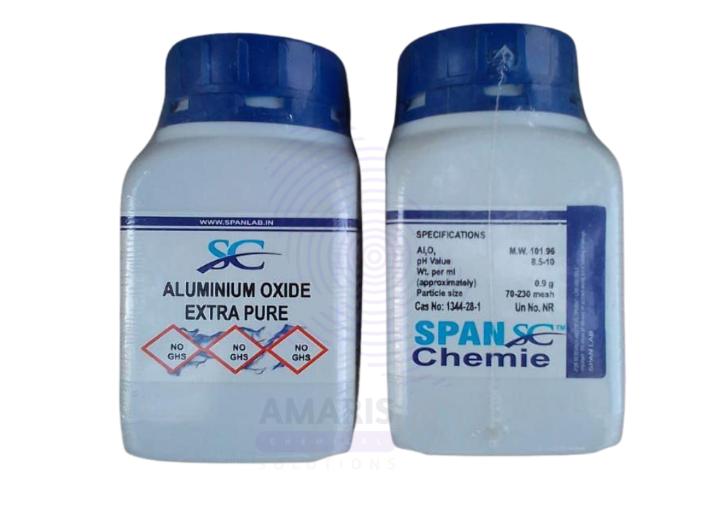 Aluminium Oxide Extra Pure is a high-purity, white, odorless crystalline powder widely used in laboratory applications for its chemical stability, hardness, and high melting point. It serves as a reliable reagent in inorganic synthesis, a polishing and grinding medium in sample preparation, and a support material for catalysts in chemical reactions. This form of alumina is also used in adsorption studies, ceramic research, and as a desiccant in controlled drying processes. Its extra pure grade ensures minimal contamination, making it suitable for sensitive analytical work and high-precision experiments. For optimal performance, it should be stored in a dry, tightly sealed container to prevent moisture absorption and maintain its physical integrity.