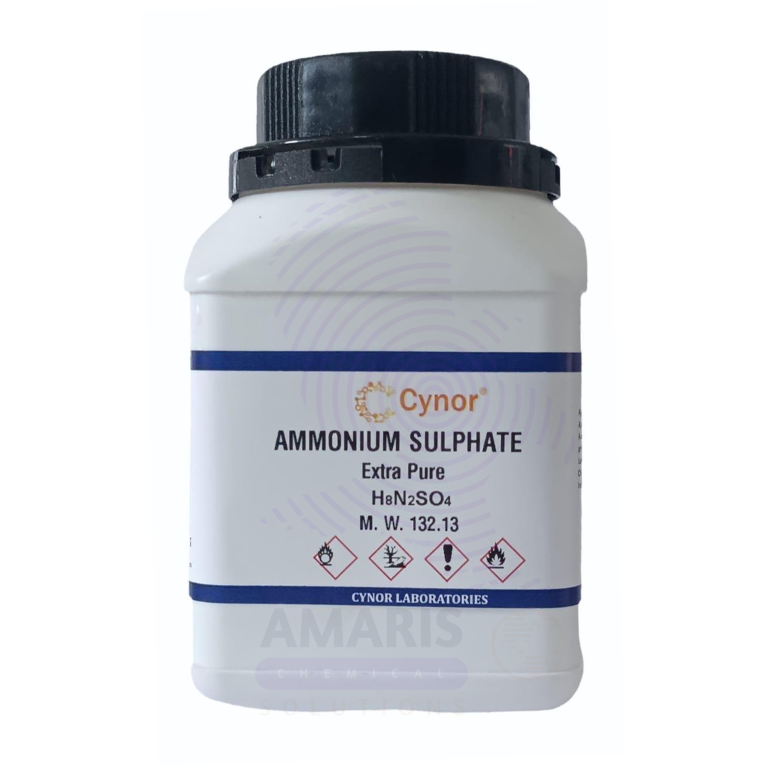 Ammonium Sulphate Extra Pure is a high-purity, white crystalline compound widely used in laboratory settings for biochemical, analytical, and inorganic chemistry applications. It is especially renowned for its role in protein purification through salting-out techniques, where it helps to selectively precipitate proteins without denaturing them. In analytical chemistry, it is used as a source of ammonium and sulfate ions in standard solution preparation and as a supporting electrolyte in various reactions. Its extra pure grade guarantees minimal contaminants, making it suitable for sensitive experiments and research involving enzymes, buffers, and molecular biology. It should be stored in a tightly sealed container in a cool, dry environment to prevent caking and moisture absorption.