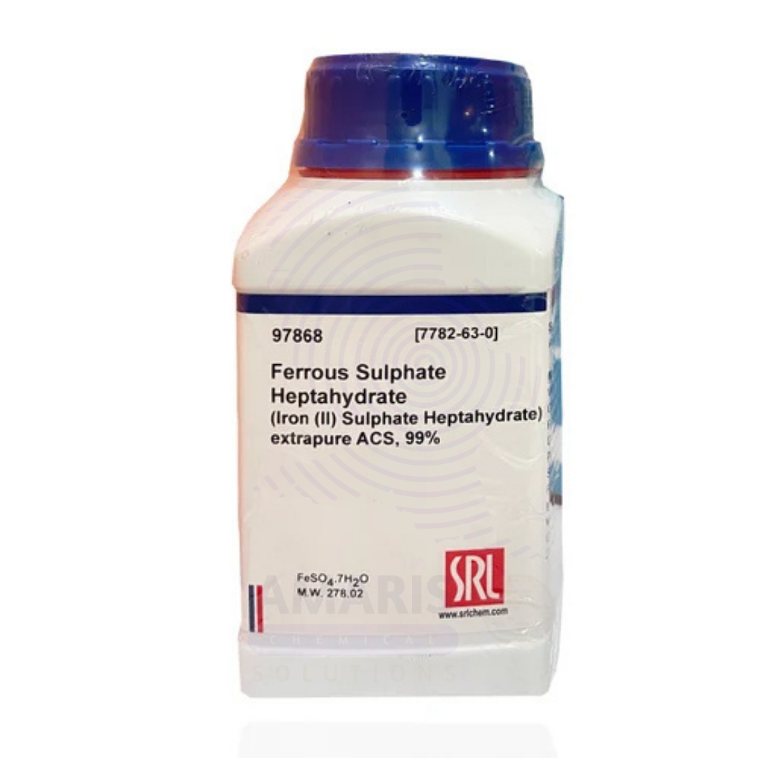 Ferrous Sulphate heptahydrate Extra Pure is a high-purity laboratory-grade chemical commonly used as a reliable source of ferrous ions (Fe²⁺) in analytical chemistry and educational experiments. With its vivid blue-green crystalline appearance, this compound plays a crucial role in redox reactions, qualitative analysis, and titration procedures. It is frequently utilized in the preparation of iron standards, as a reducing agent, and in experiments that demonstrate oxidation-reduction principles. Due to its high level of purity, it is well-suited for controlled laboratory environments where consistent and accurate results are essential. Proper storage in a cool, dry place is recommended, as the compound is prone to oxidation and moisture sensitivity.