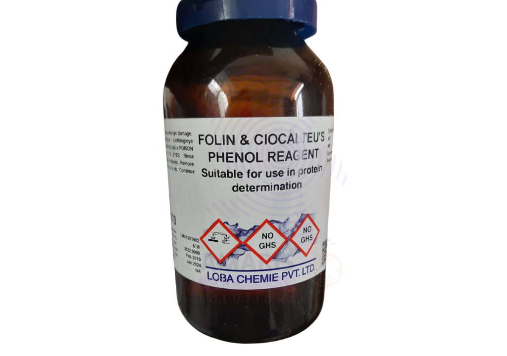 Folin Ciocalteus Phenol Reagent Extra Pure is a high-grade chemical solution widely used in analytical chemistry and biochemistry for the colorimetric determination of phenolic and polyphenolic compounds. It functions by reacting with phenol groups to produce a blue complex, the intensity of which is directly proportional to the concentration of phenols present in the sample. This makes it an essential reagent in food science for measuring antioxidant capacity and total phenolic content in fruits, vegetables, beverages, and plant extracts. Its extra pure formulation ensures precision, reproducibility, and minimal background interference, making it ideal for research, quality control, and advanced laboratory applications.