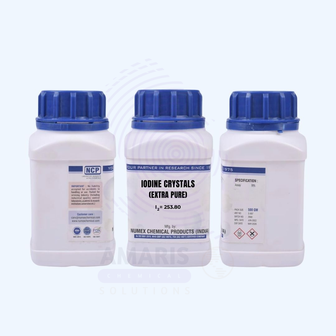 Iodine Crystals Extra Pure are dark violet, lustrous flakes known for their high purity and reliable reactivity. They are widely used in analytical chemistry, pharmaceutical formulations, and as a key reagent in iodine value determination, starch testing, and microbial staining. Their antiseptic properties also make them useful in disinfection and laboratory microbiology. Due to their sublimation tendency, iodine crystals should be stored in tightly sealed containers in a cool, dry, and well-ventilated area. Their purity ensures minimal contamination, making them ideal for precision work in research and educational laboratories.