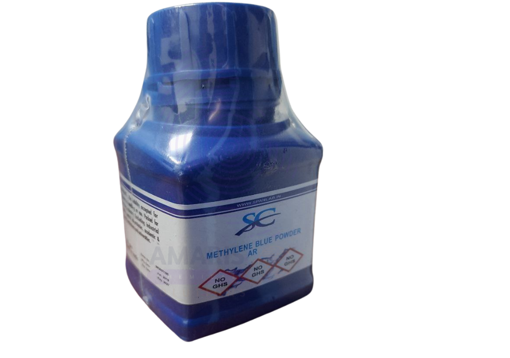 Methylene Blue Powder Extra Pure is a high-grade dye with diverse laboratory and industrial applications. It is widely used as a biological stain in microscopy for highlighting cellular structures such as nuclei, bacteria, and parasites, particularly in blood smear and bacteriological studies. In chemistry, it serves as a redox indicator due to its distinct color change properties, and in aquaculture, it acts as a treatment for fungal and bacterial infections in fish. Its extra pure formulation ensures maximum staining clarity, minimal contamination, and reliable results in research, diagnostics, and educational settings.