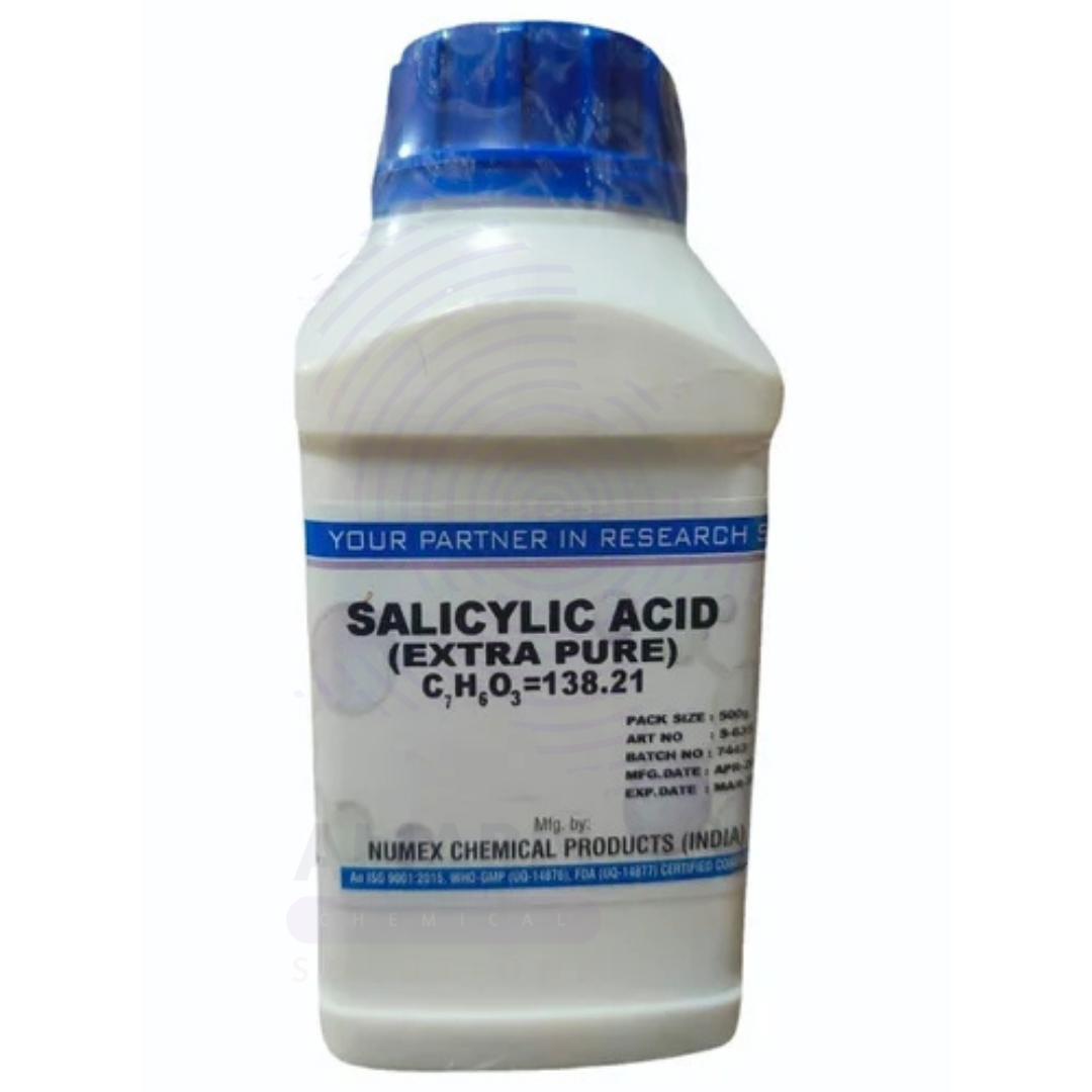 Salicylic Acid Extra Pure is a white crystalline powder with the chemical formula C7H6O3, widely recognized for its use as a key pharmaceutical intermediate and topical treatment agent. It possesses keratolytic, anti-inflammatory, and antiseptic properties making it essential in acne and psoriasis formulations. In laboratory applications, it serves as a chemical reagent for organic synthesis and analysis. Its solubility in organic solvents and moderate acidity enable it to be versatile across pharmaceutical, cosmetic, and chemical industries. The Extra Pure grade ensures high purity suitable for research, pharmaceutical, and cosmetic use. Proper storage in a cool, dry place away from incompatible substances preserves its quality and effectiveness. Handling precautions include avoiding inhalation and skin contact due to its irritant nature.